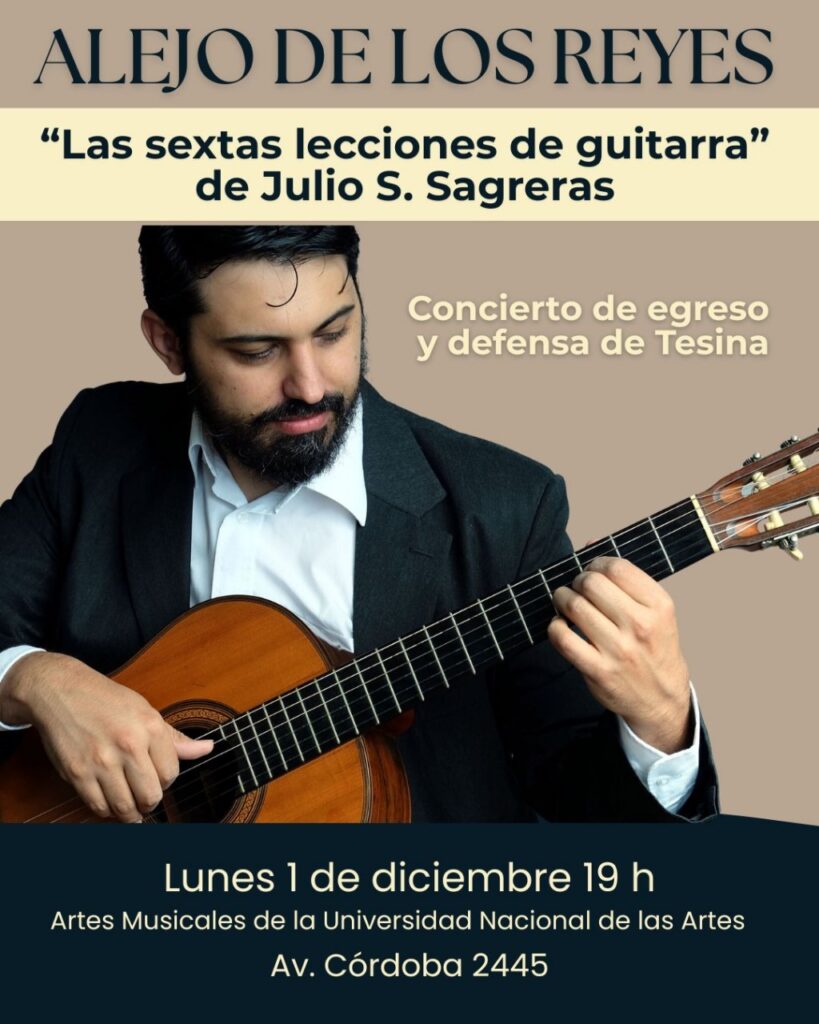 Julio S. Sagreras (1879–1942) creó seis libros de “Las lecciones de guitarra”. Estos estudios, el resultado de la experimentación y la sensibilidad musical de Sagreras, muestran una progresión técnica y expresiva impecable, del simple toque de cuerdas en la primera lección al “movimiento perpetuo” final del sexto libro. El concierto (que acompaña un detallado artículo teórico) se centrará en “Las sextas lecciones de guitarra”, piezas que sintetizan la tradición técnica del siglo XIX y, a la vez, abren un lenguaje nuevo fruto de la experimentación y sapiencia de su autor. Además, a través de las dedicatorias en cada una de las treinta lecciones, “Las sextas…” brinda un panorama del riquísimo ambiente guitarrístico de la Buenos Aires del principio del siglo XX.